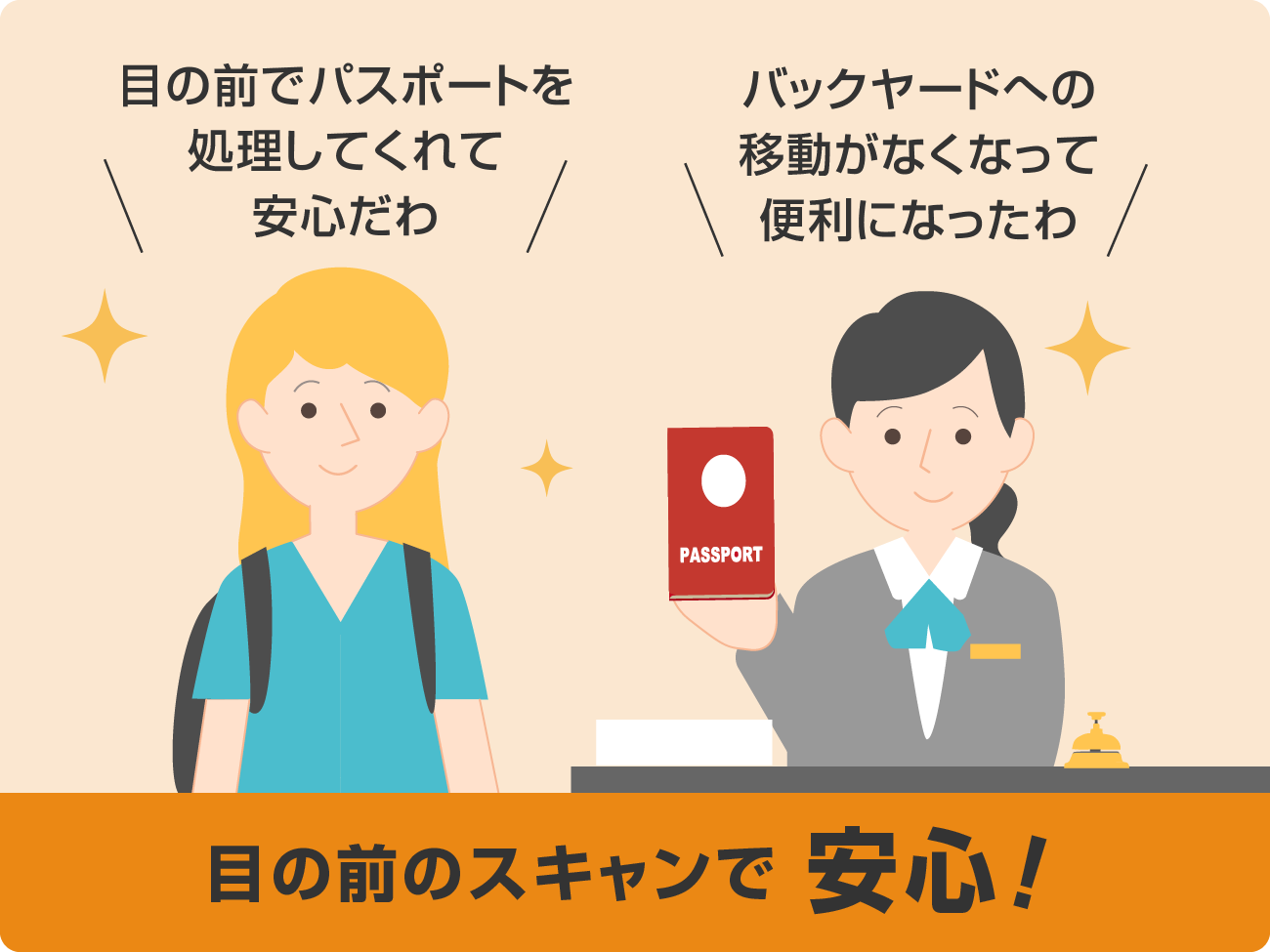 大事なパスポートを見えない場所に持って行かれるのは、お客様も不安。手間がかかるうえに、無駄な待ち時間も生まれてしまう