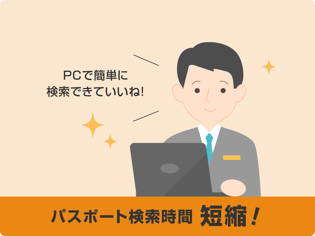 パスポートの写し(紙)の保管スペースが不要になります。警察・保健所からの照会時にも、日付などでパスポートスキャンデータを簡単・素早く検索し、印刷して提示が可能になります。作業時間が大幅に短縮でき、お客様をお待たせしません。