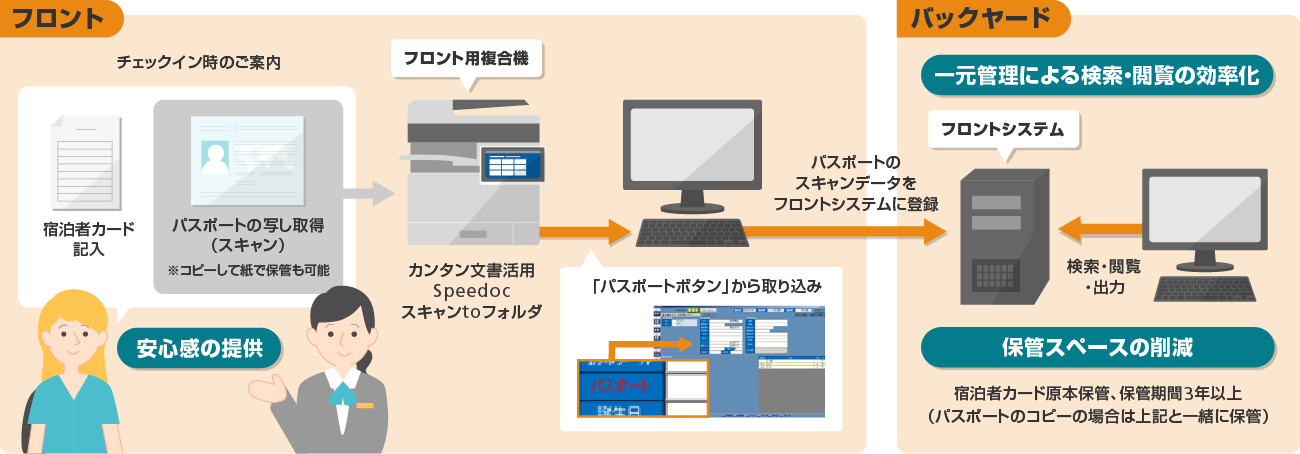 フロントに設置した複合機でパスポートを処理することで、フロントの作業時間も短縮され、お客様の安心にもつながります。スポートをスキャンしたデータはサーバに保存して一元的に管理できます。