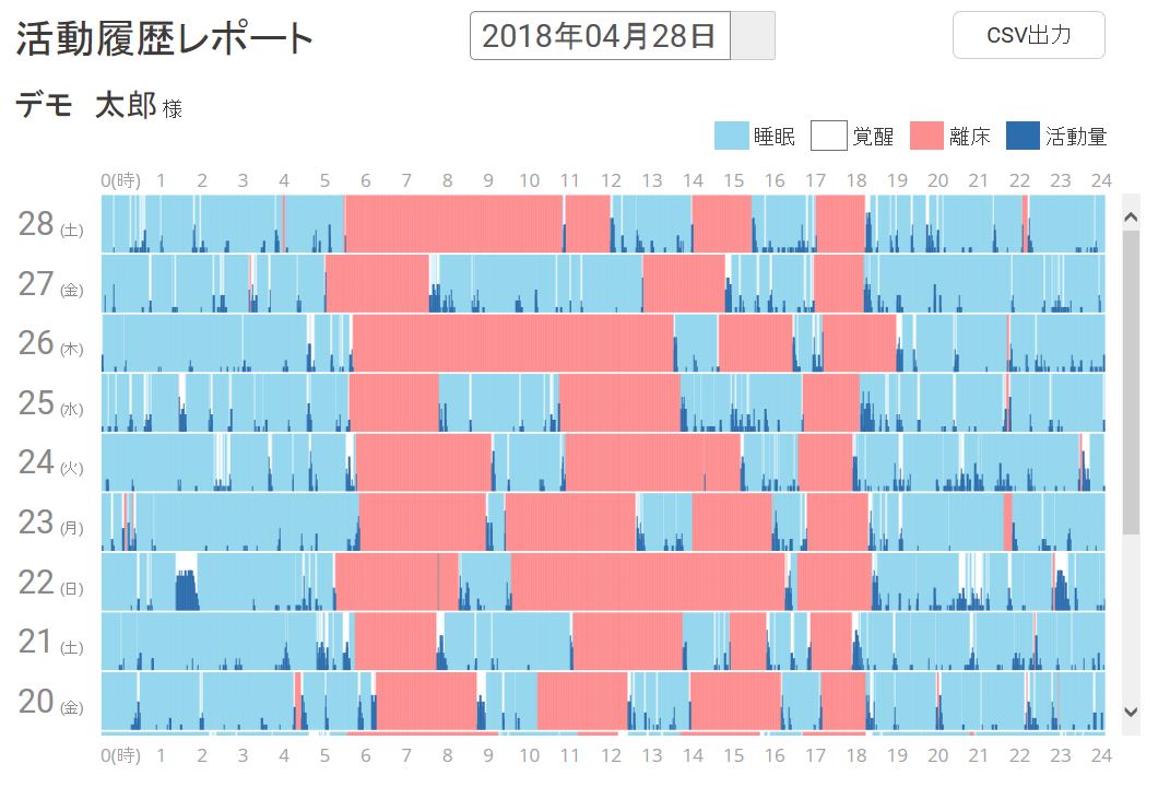 睡眠・覚醒の状況を時系列でグラフ化した"活動履歴レポート"により、入所者の生活リズムを把握できます。