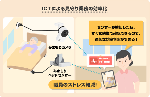 リコーみまもりベッドセンサーと見守りカメラ、及び記録システムを連携して活用することで転倒リスクの削減、訪室の適正化、入所者の睡眠確保、記録業務の負担軽減を実現します。
