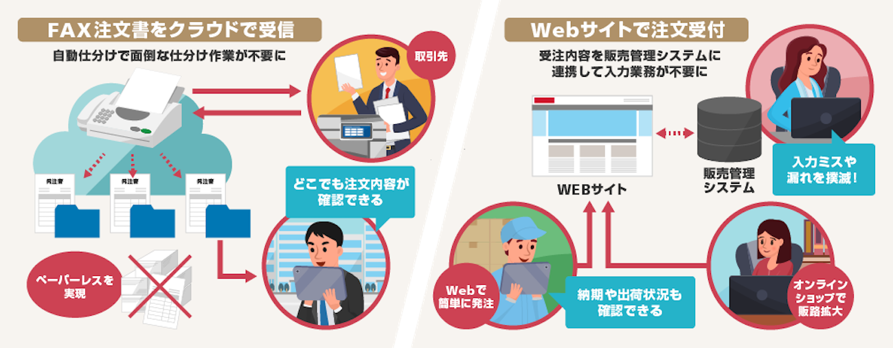 受注業務効率化パックは、FAX受注業務をクラウドへ、またはWeb受注システムへ移行することで、「FAXの前に行かないと業務ができない」「大量の注文書の仕分けや販売管理システムの入力が大変」「問い合わせの対応で業務が中断する」など受注業務が抱える課題を解決するソリューションです。
