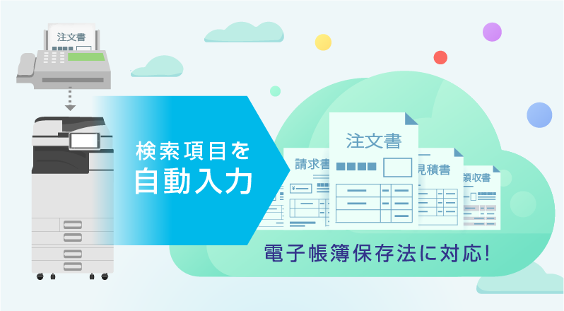 ペーパーレスファクスで受信した証憑を、RICOH 証憑電子保存サービスへ簡単にアップロード。アップロード時に金額以外の検索項目を自動入力。
