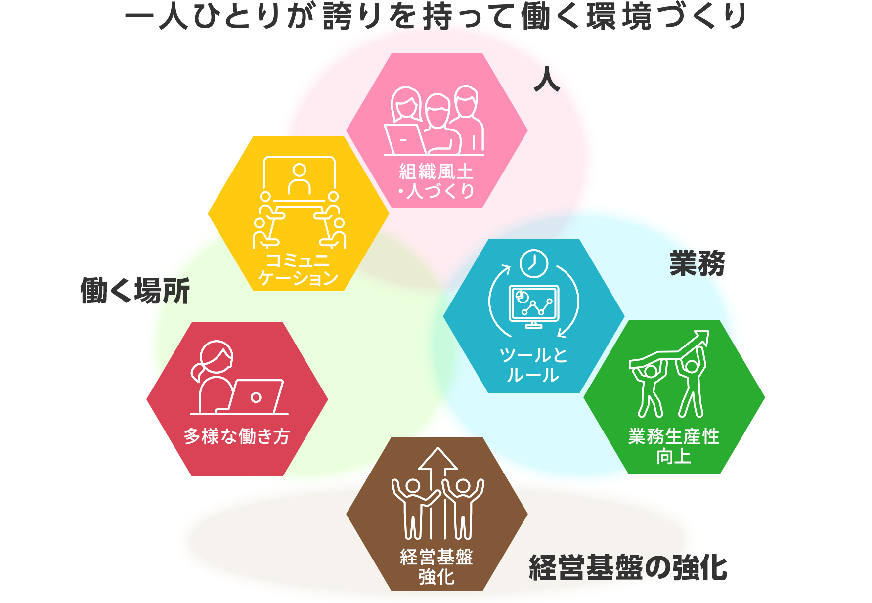 生産性を向上させるために、業務プロセスを見直し、リモートワークの実現、フレキシブルな勤務形態などを、人事制度・労務管理・組織風土の改革と並行して進めて参りました。個人およびチームとして最大のパフォーマンスを発揮し、新たな価値を生み出し続けることができる働き方を実現していきます。 勤務形態の改善、ダイバーシティ&インクルージョンの取り組み、健康経営の展開もあわせてご参考ください。
