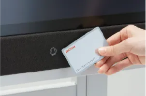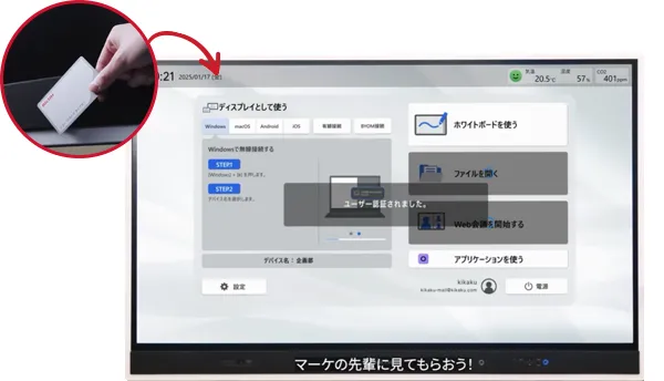 ICカードをタッチするだけで、RICOH Collaboration Boardの利用者認証に合わせて、Microsoft 365のアカウントにSingle Sign Onされます。ICカード認証によりセキュアに利用できるだけでなく、認証者のアカウントから会議に必要な情報が素早くセットされるので、特別な準備をすることなく会議をスムーズに開始できます。