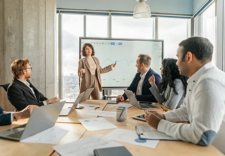 本社と支社、取引先とのオンライン商談といった異なる拠点間でも臨場感のあるディスカッションが可能。出張コストを軽減し、これまで参加できなかったメンバーも参加できます。