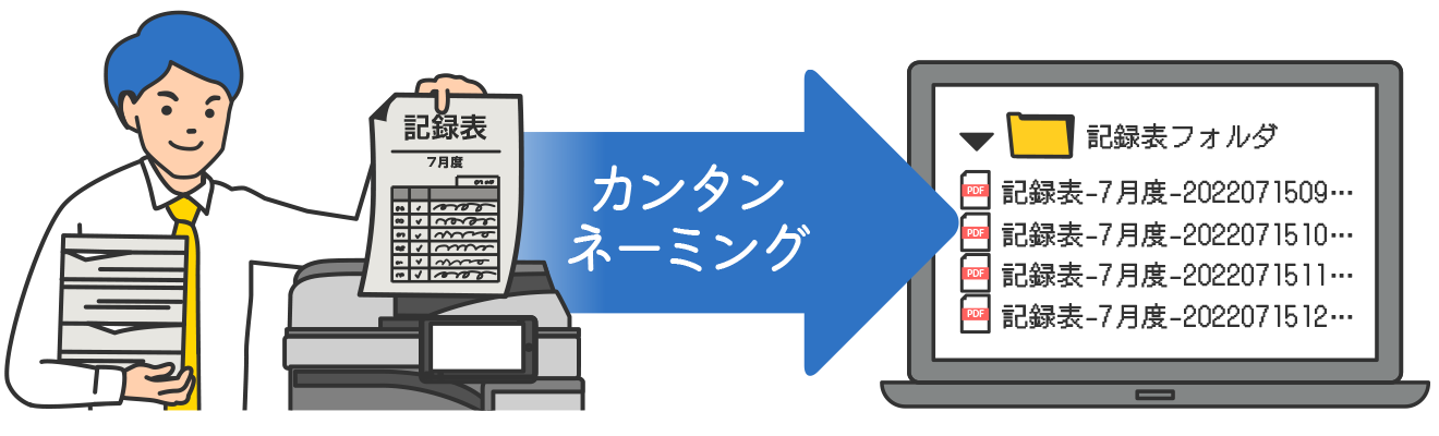 スキャンするだけで文書の表題などを自動的に読み取り、適切なファイル名を生成して電子保管します。