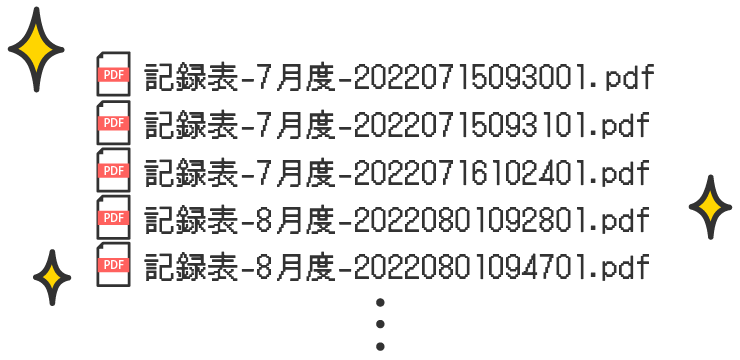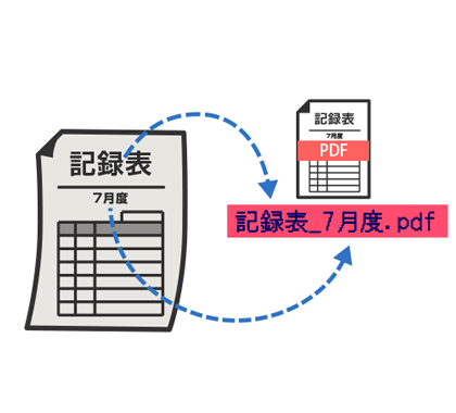 文書の表題などにスキャン日時を加え、ファイル名としてルールを統一。入力ミスの心配もなく、検索・共有が容易になります。