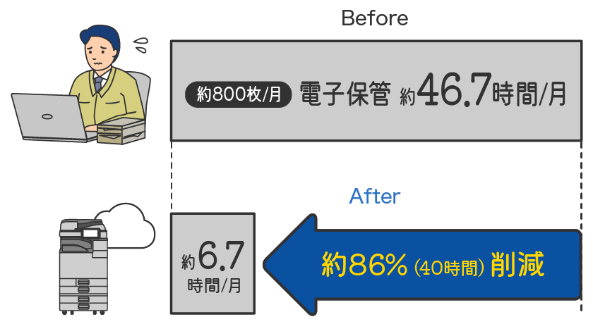 スキャンしパソコンでのリネーム作業後、フォルダー指定して電子保管していた業務が、スキャンするだけになり効率化しました。大量文書からの検索もスピーディーになりました。