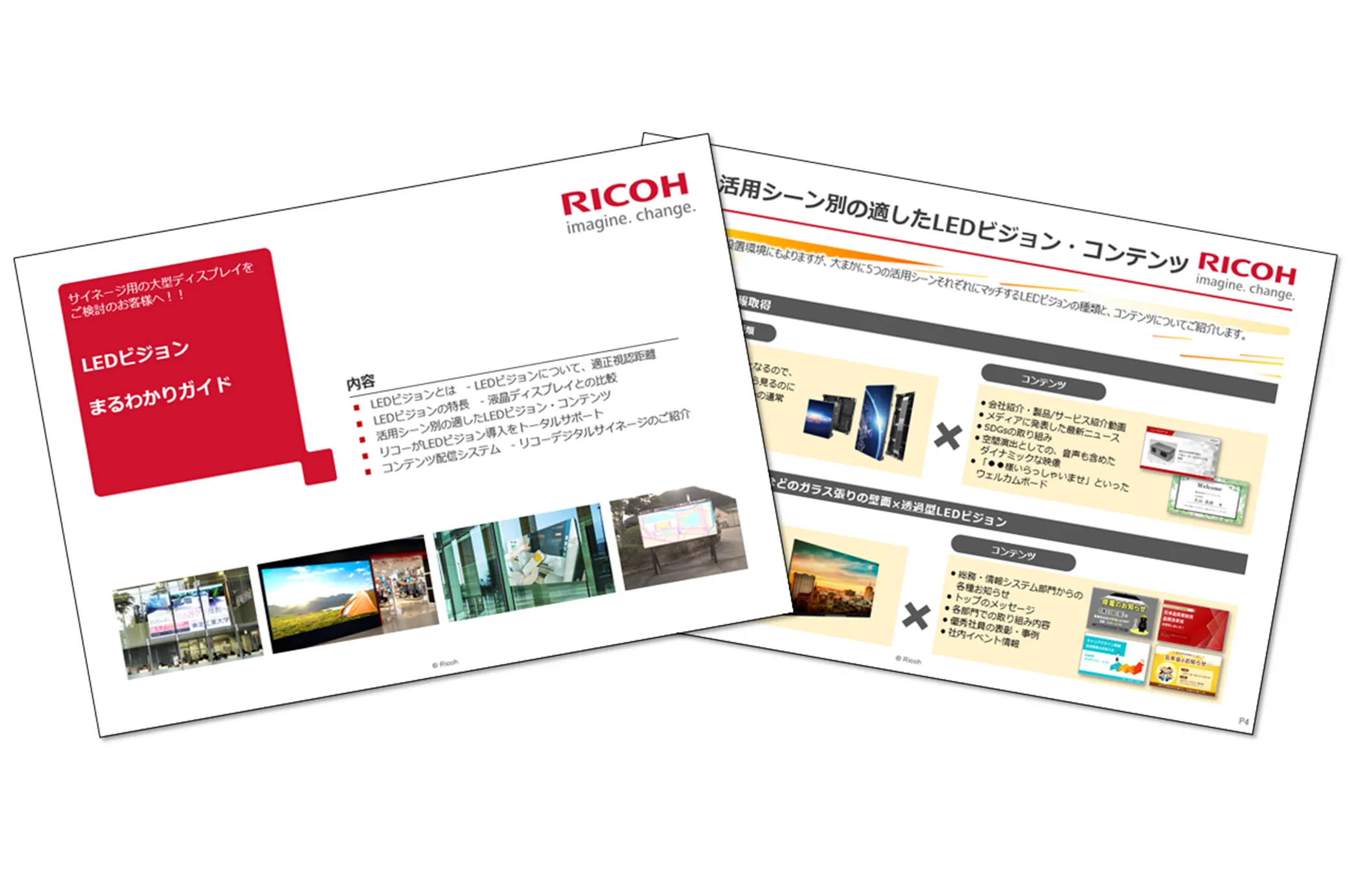 リコーが選ばれる理由リコーのLEDビジョンは、ニーズや要望に合わせて包括的なソリューションを提供します。お客様に最適なLEDビジョンのご提案に限らず、配信運用システムの構築、コンテンツ制作、設置から保守まで、LEDビジョンの導入に関する全てのステップでお客様をサポートします。