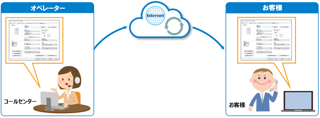 操作方法が不明な場合や各種トラブル時にお客様の複合機のパネルを遠隔で確認しながらサポートを行うサービスです。インターネット経由で、コールセンターのオペレーターが機器の画面を確認しながら操作方法の説明や障害復旧の支援を、より的確・迅速に提供いたします。